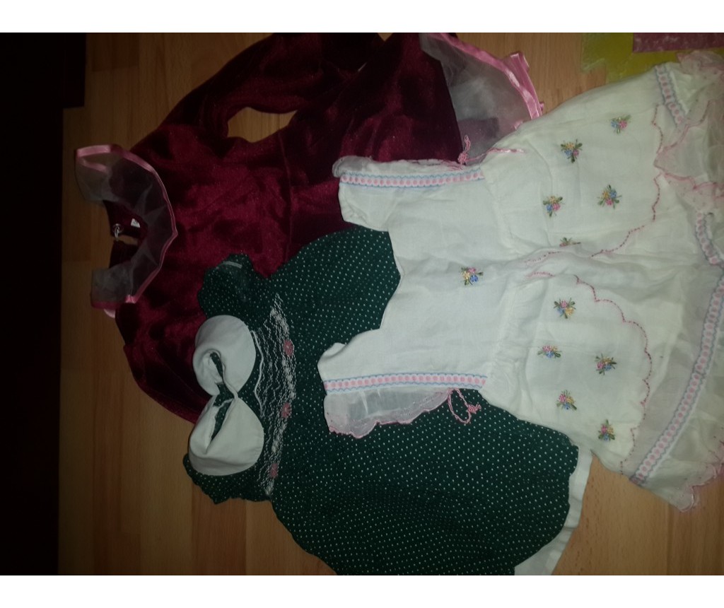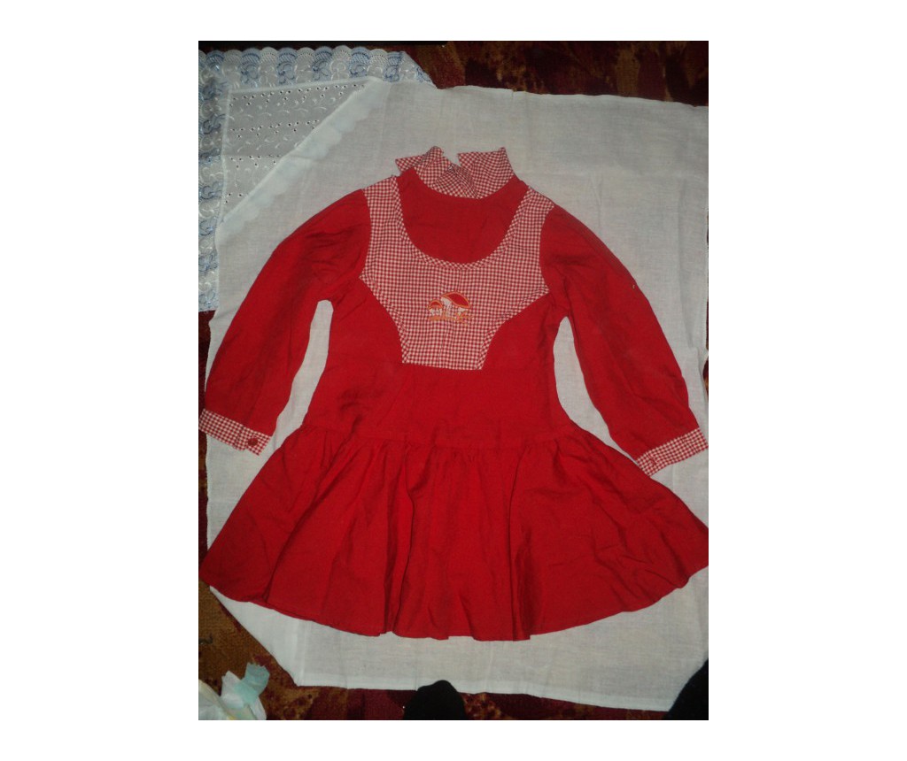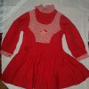 Платье красное. наверное шерстяное. состояние отличное. Можно даже в садик. Длина от плеча до низа 58 см