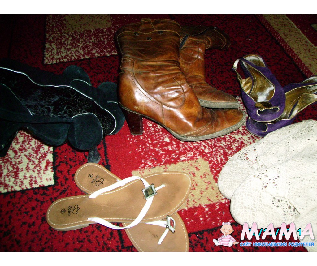 Отдам пакет обуви размер 39-40 (зимние кожаные рыжие сапоги, замшевые демисезонные, вязаные сапожки, сереневые босоножки и белые шлепки), требуется мелкий ремонт (поменять набойки в зимних и стельки в вязаных сапожках). Район Намыв, желательно забрать все сразу, не откажусь от черной шоколадки