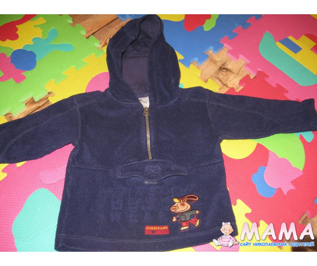 Флиска синяя, сильно б/у, но очень удобная для двора с карманом на липучке, можно туда и платок и машинку положить 12-18месяцев, но мы носили с 10месяцев и до 2хлет