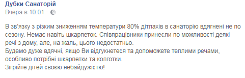 Николаевский санаторий «Дубки» обратился ко всем небезразличным гражданам области с просьбой оказать помощь детям теплой одеждой. Более всего нужны носки и колготки. Температура воздуха резко снизилась, и, оказалось, что 80% детей одеты не по сезону. Сотрудники санатория надеются, что небезразличные граждане найдут возможность передать вещи, одежду детворе.