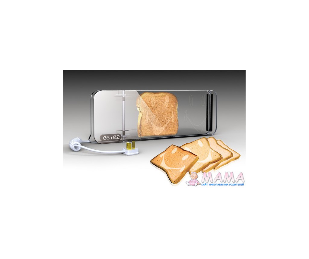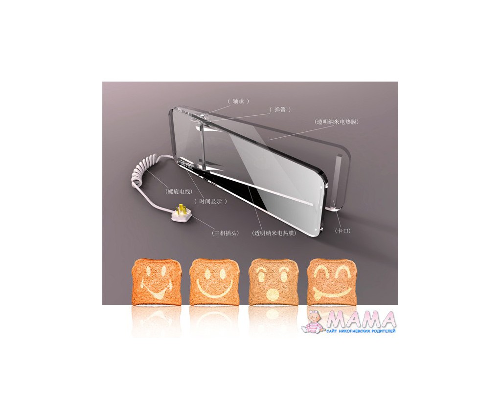 усовершенствованная разработка от китайца Ху Ян Хьянга (Xu Yan Xiang). Он предлагает выпускать прозрачный тостер, в котором можно выпекать тосты с разными смайликами. Нагревательный элемент здесь — металлические проводки в стеклах.