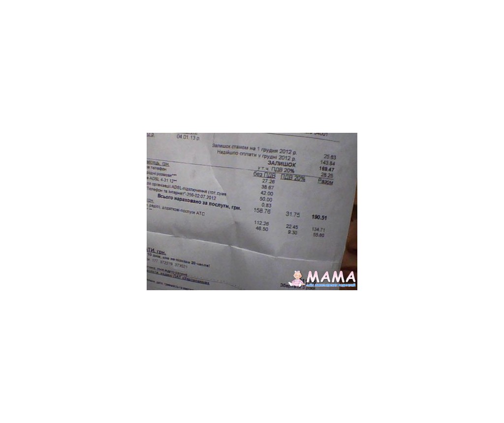 Пришел счет с невероятно огромной суммой в 211 грн.В прошлом месяце подключала интернет и телефон.За подключение оплатила сразу же,а за выезд спец.на дом сказали включат в первый счет.Включили-оплатила в прошлом месяце 145 с учетом этих 50 грн.И вот в этом счете(за декабрь)они снова включают в оплату эту услугу.Я ничего не понимаю.Расшифруйте мне этот счет,кто умеет.И вопрос:что такое залишок?Вотт они пишут что у меня залишок 169,47.Это долг или преплата?