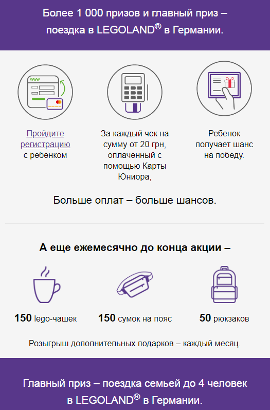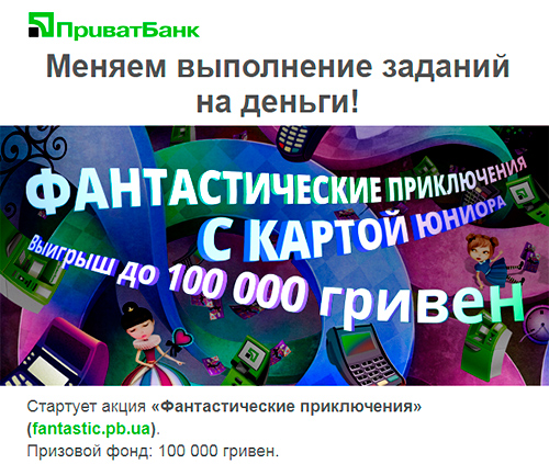 Акция уже давно закончилась, друга мы нашли и пригласили, это было последним заданием. Спустя какое то время, начали искать имя ребёнка в списках победителей, его там не оказалось, хотя все задания были выполнены. А потом звонок с банка с просьбой принести копию кода, принесли. Спустя где то месяц,когда уже и не ждал никто, на счёт капнул призовой фонд 350 грн, приятненько.