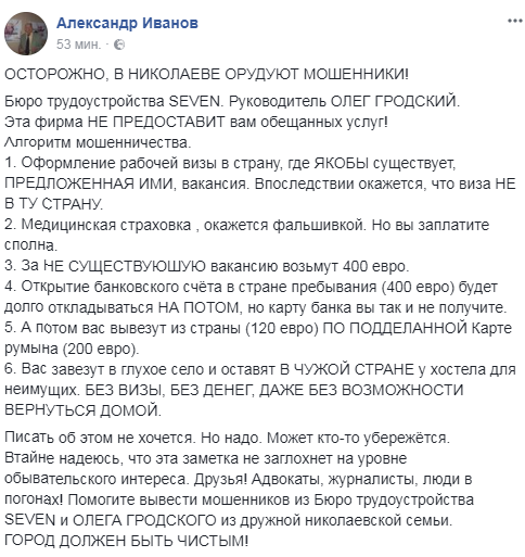 Очень часто в поисках работы жители Николаева и области стремятся выехать за границу. Порой эти попытки становятся неудачными. К сожалению, такое происходит из-за доверчивости наших граждан и по причине мошенничества со стороны различных фирм, занимающихся трудоустройством. об одном из таких бюро рассказал Александр Иванов на своей странице в Фейсбук.