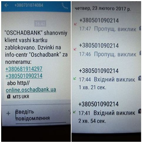 Мама перезванивает по номеру указанному СМС в полной уверенности - это номер Ощадбанка, ну в СМС же указано, с сайтом же и очень похоже на стилистику банковской рассылки.