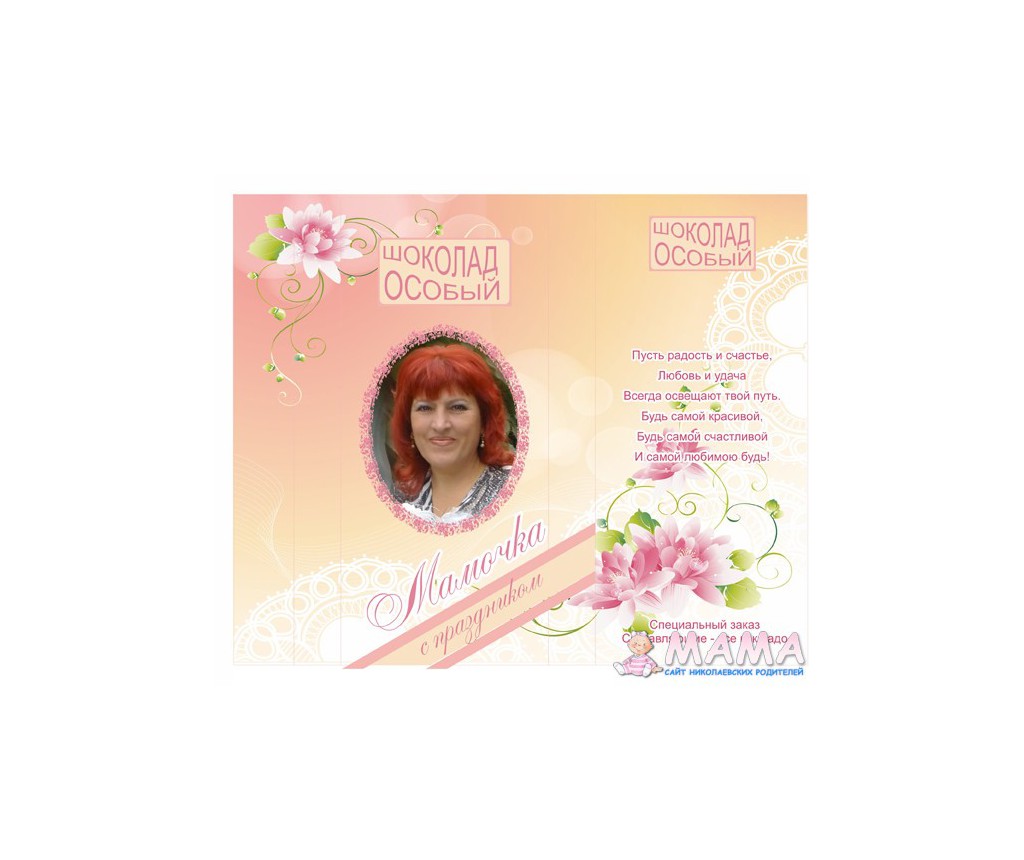 Цитата: #9536 baskaya 08 February 2013, 10:08Евгения Д., подарите ей что-то именное, с трогательными стихами, вашими фото: красивое вино, если любит, с именной этикеткой, альбом, чашку, плакат, фотокнигу, если есть время. Вот такую я шоколадку рисовала маме на день рождения, только писала на ней другие стихи:
