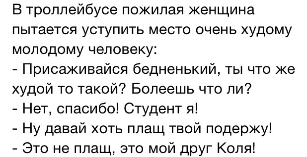 Автобус. Давка. Над сидящим мужичком нависает другой мужчина, который держит на весу сумку и одновременно этой же рукой поручень. Из сумки что-то капает сидящему на нос. Тот облизывает — что-то солененькое оказалось.