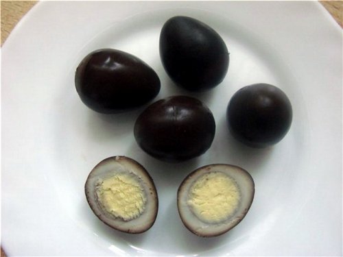 Черные яйца. Как и многие другие блюда китайской кухни, черные яйца считаются сильнейшим афродизиаком (любовным стимулятором). По сути это – утиные яйца, обмазанные смесью золы и известью, содой, солью и водой и выдержанные в земле от 20 до 100 дней. Иссиня-черные мелкие яйца необходимо есть без всяких приправ и гарниров. Только не вздумайте принюхиваться!