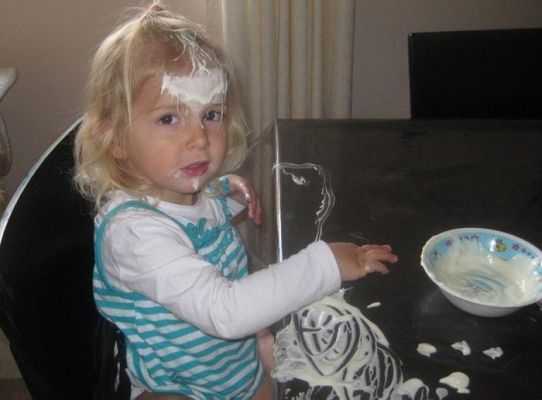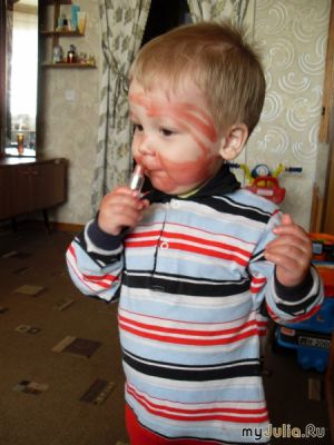 Всі рівні білі поверхні (стіл, холодильник, плитка на стінах) і дзеркала (у нас великі дзеркальні шафи) постійно густо помальовані восковими олівцями (при цьому ж кольори підбирає такі яскраві, насичені - темно-синій, вишневий). Вже часом не змиваю, бо як тільки поверхня стає чистою, з'являється син і дістає із заначки черговий олівчик. Один раз полотном став мій ЖК монітор комп'ютера. Але тут я вже не стрималася і тепер дитина до монітору не наближається.