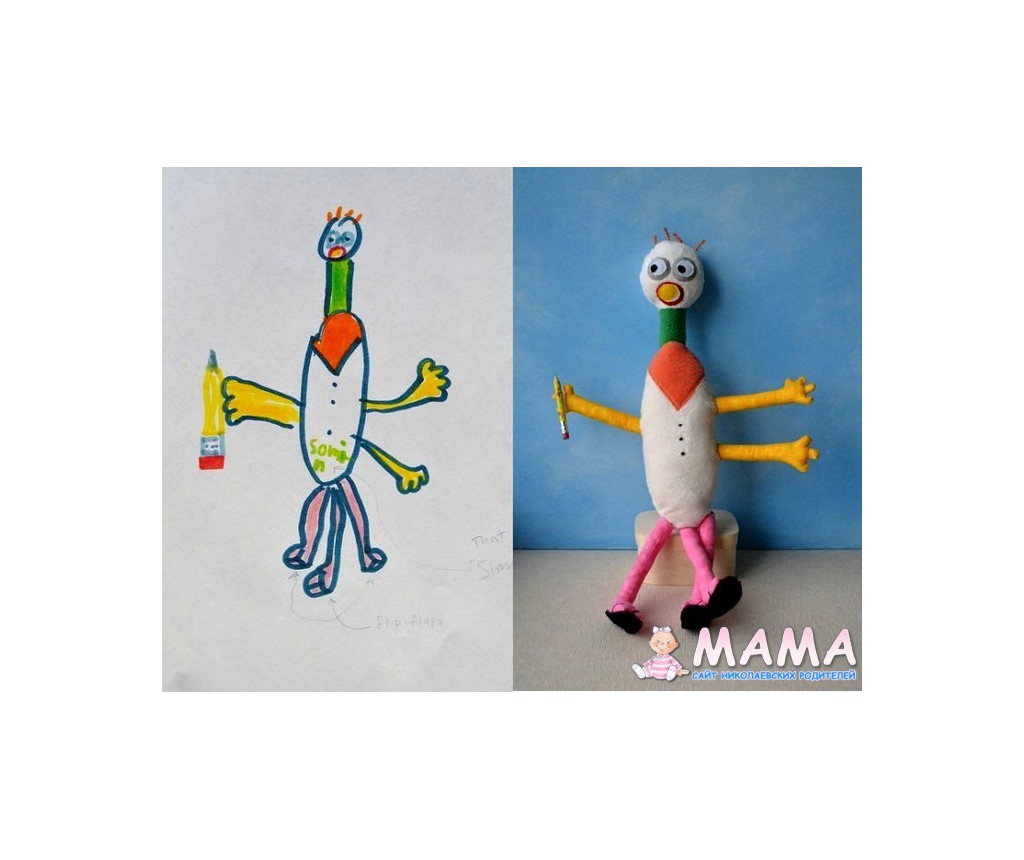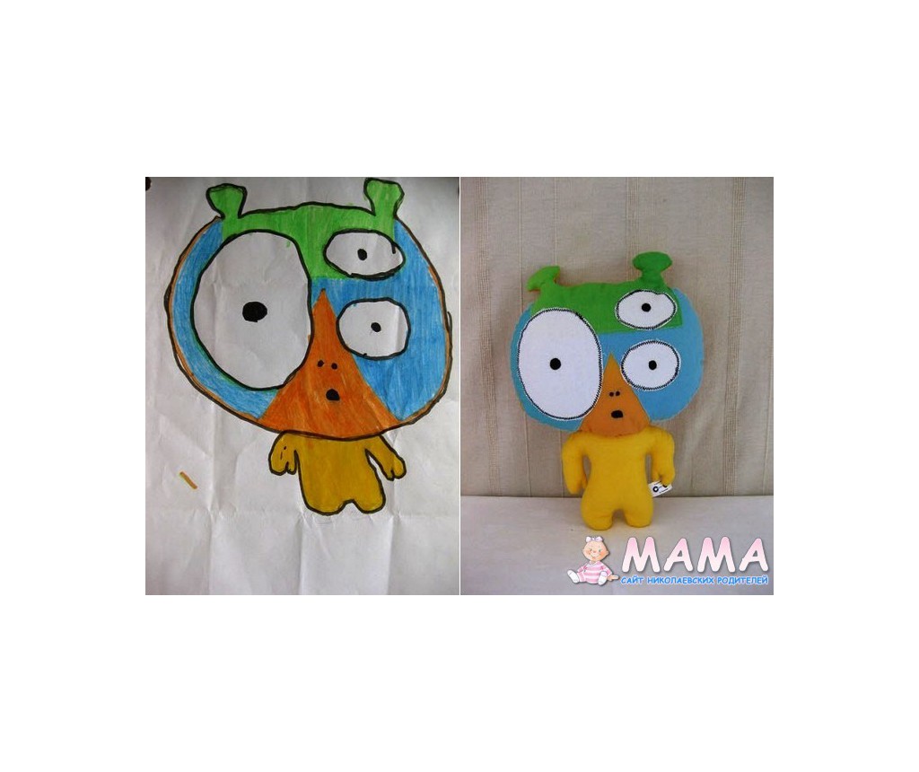 дитячі малюнки та іграшки, створені за їх мотивами. якби не малюнок поруч, то що б можно було подумати про автора