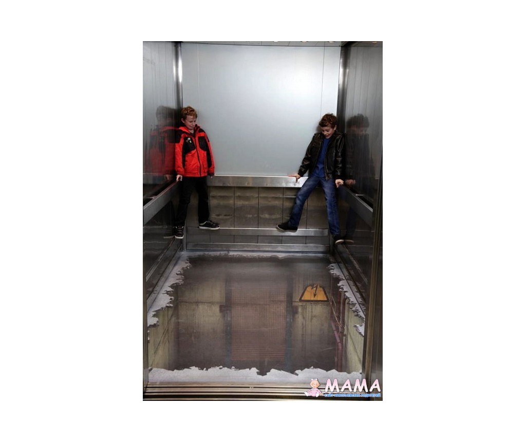 а ось це справжній жах! в багатоповерховому торговому центрі в ліфті замість підлоги дірка! намальована.....