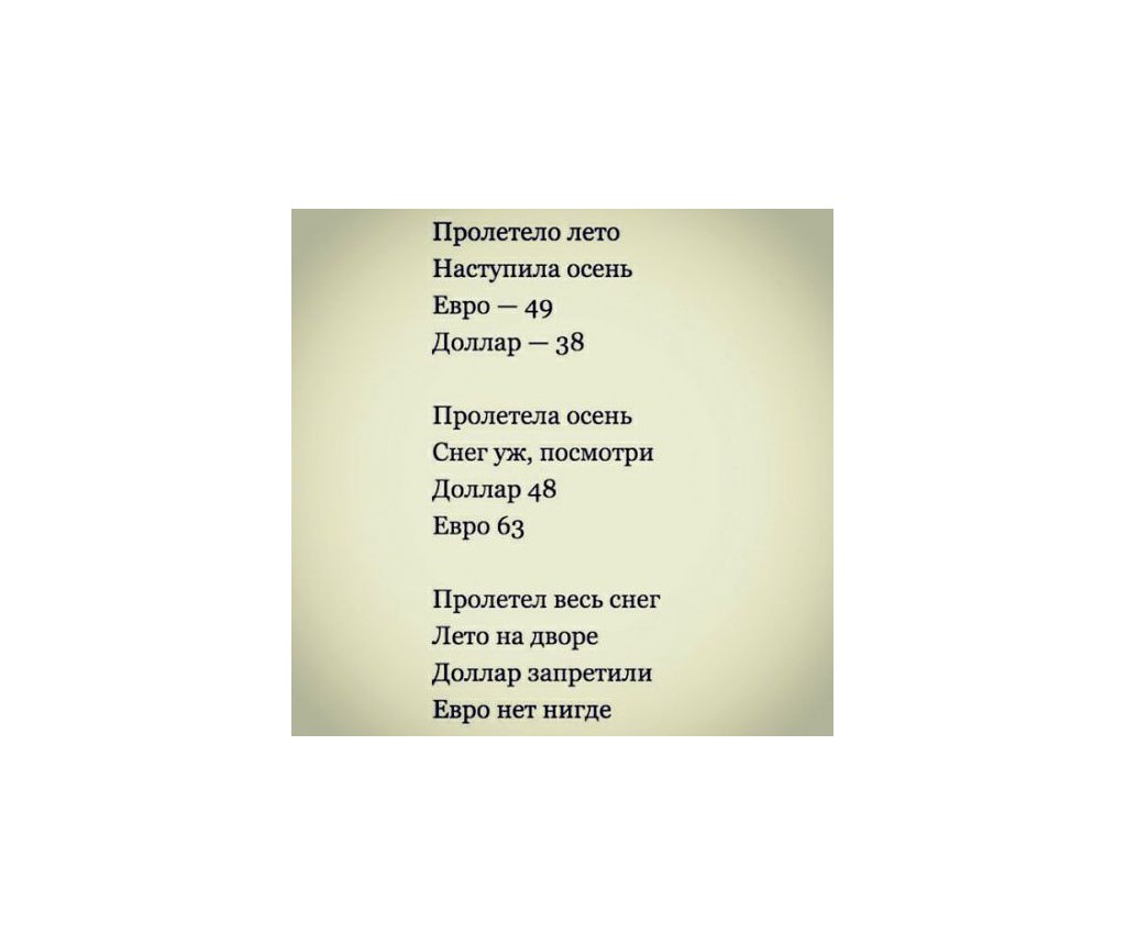 Цитата #1018851 от Ссылка 27 Февраль 2015 12:25Про курс виртуальный. На вебманевской бирже паника, утром заглянула, продать доллар можно было по 32, пока добралась до компа - 31, чтобы продать, пришлось долго соревноваться с курсом, едва успела спихнуть по 30, сейчас уже 28