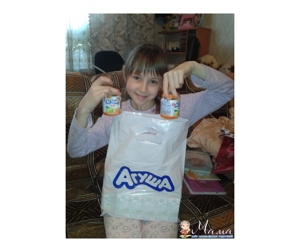 Пришло 5 пюрешек со вкусом "Груша" и 5 соков "Яблоко-вишня". Знакомы мы с "Агушей" ещё с самого начала прикорма. Тогда ребёнок впервые попробовал творожок, от которого его просто невозможно оторвать!