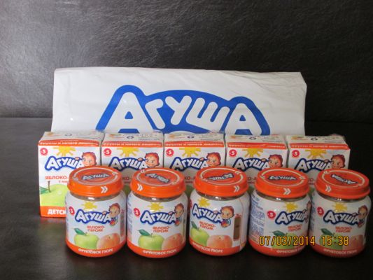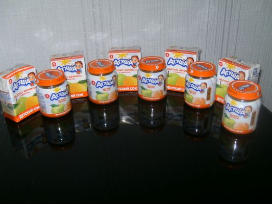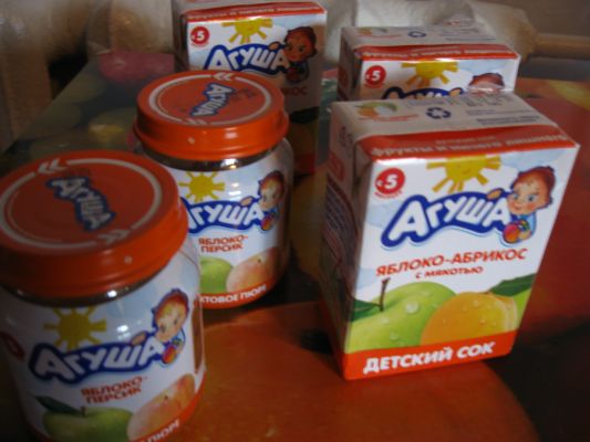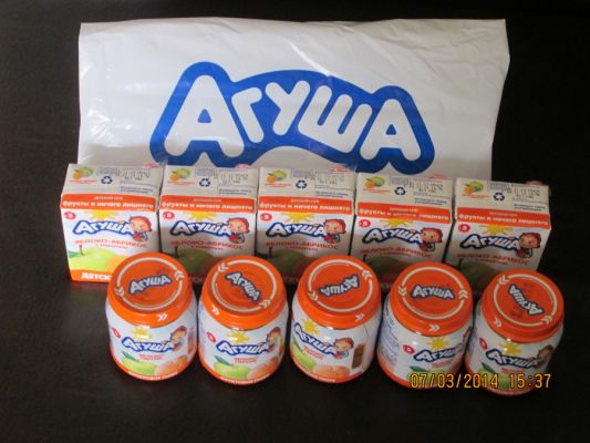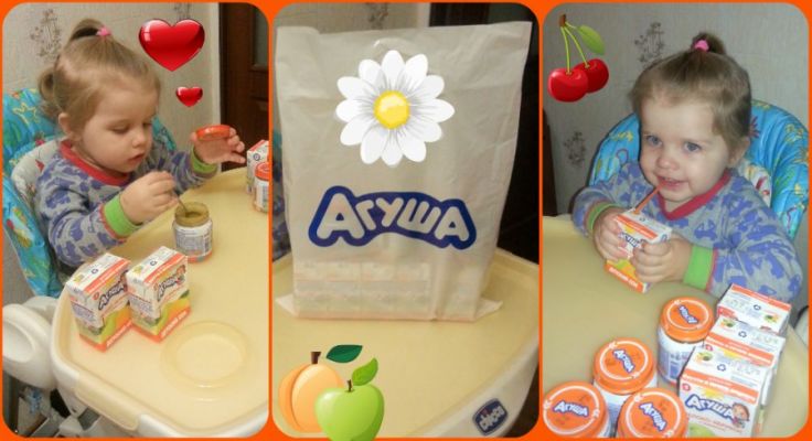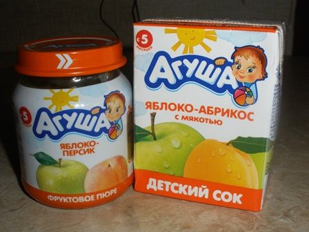 С "Агушей" мы дружим с 7 месяцев.Первым прикормом у нас было пюре яблочное.Затем мы с удовольствием попробовали творожок,кефир.Все очень вкусно и полезно.Мне нравится упаковка ,которую очень удобно брать с собой на прогулку.Что касается пюре яблоко-персик,мне очень понравился вкус ,не кислый,не приторный.Радует то,что отсутствует сахар,а вместо него фруктоза,что очень хорошо для малыша.Еще удобно то ,что на банке есть отметка 50 грамм,особенно для тех ,кто только начинает вводить прикорм.Мне также понравился яблочно-абрикосовый сок.Мой ребенок почему-то пьет соки без мякоти так себе,а этот сок она полюбила с первого раза.Он тоже идет с небольшой кислинкой,и приятный на вкус.Его натуральность доказывает то,что после вскрытия нужно выпить в течении суток(если хранить в холодильнике),и в течении 3 часов(при комнатной температуре).Еще я обратила внимание на то,что в нем есть даже минеральные вещества,такие как калий ,натрий которые активно участвуют в формировании мышечной и опорной системы малыша.