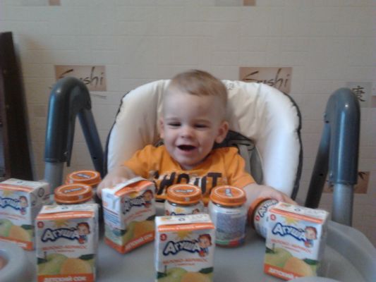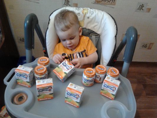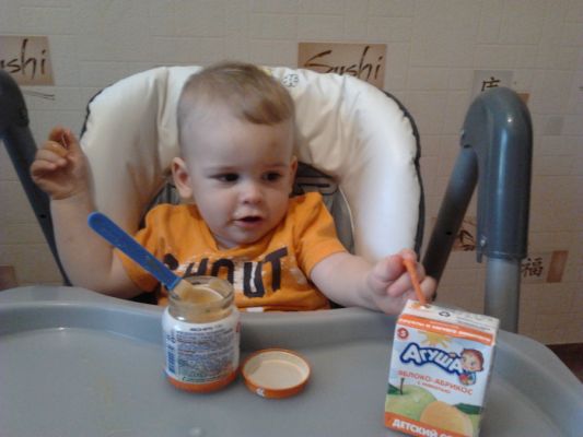 Особенно можно выделить творожки, они очень полезны для нашего малыша, так как в состав входят как фрукты, так и овощи. Хоть творожок можно давать с 6 месяцев, но сынок его попробовал уже в 4,5 месяца без всяких последствий. А фруктовые пюрешки мы просто обожаем! Ну а как не запить любимым сочком после сытного обеда?! Без этого никак=)