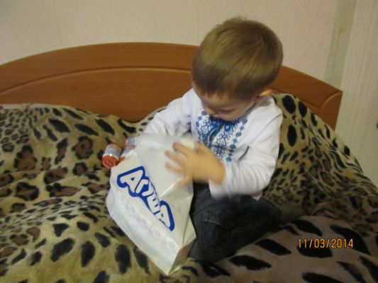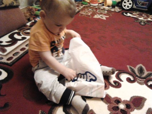 ННаконец, упаковку сняли, дальше Мишка отобрал у меня пакет и стал доставать лакомство)))