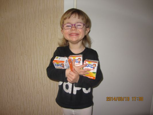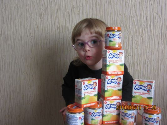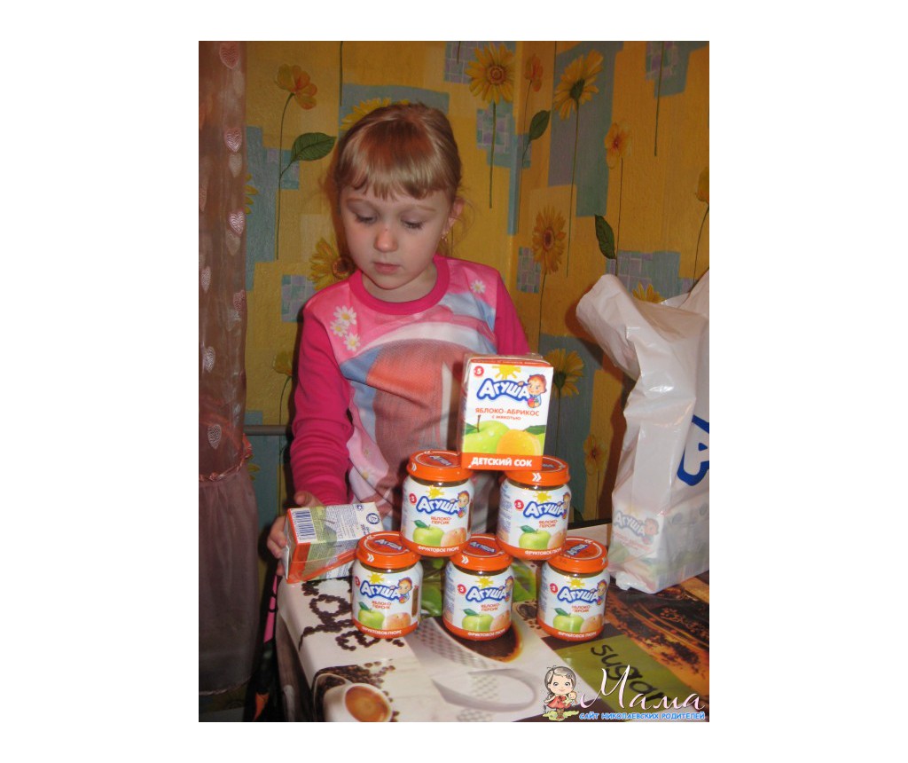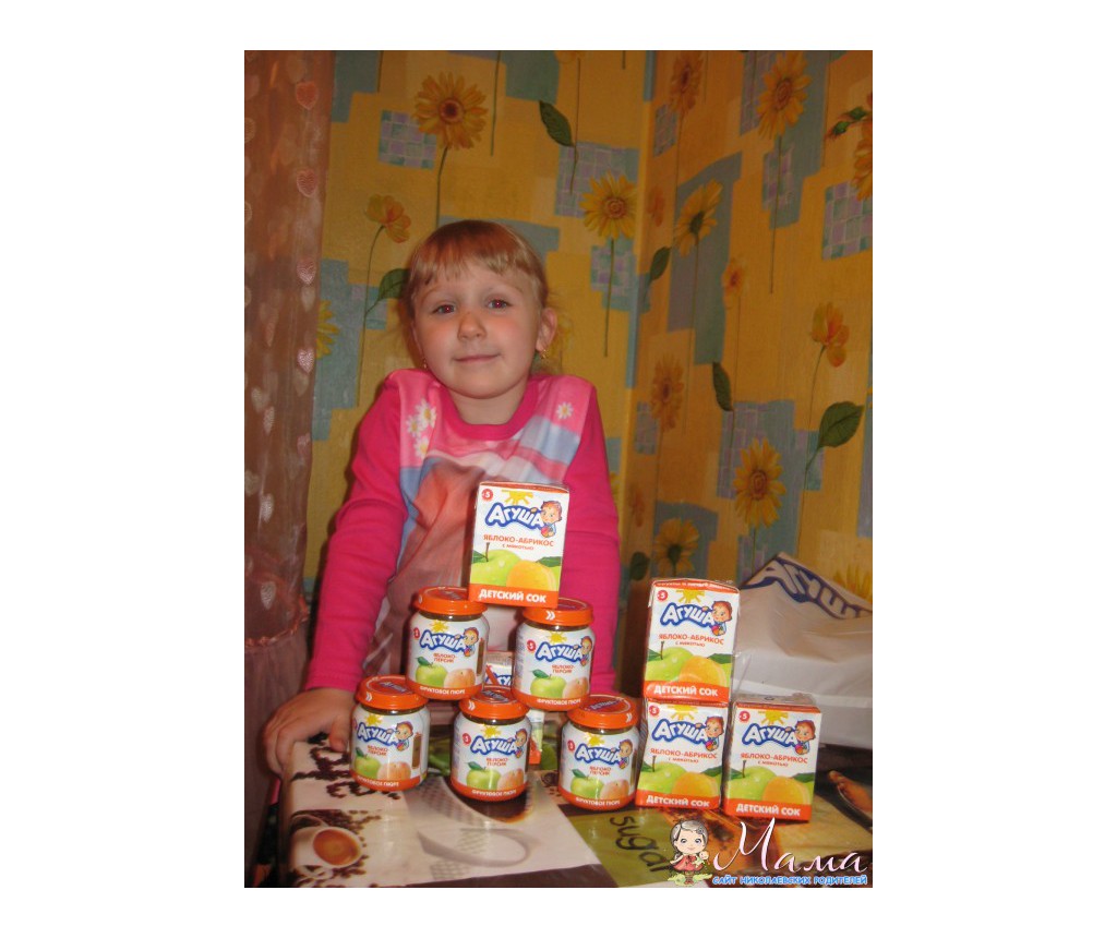 В этот раз пришло 5 пюрешек яблоко-персик и 5 соков яблоко-абрикос. Хочу выразить отдельную благодарность за Ваши пюре, т.к. только благодаря им сына наконец-то съедает всю кашу. Раньше наотрез отказывался её есть, я стала добавлять фруктовое пюре... И, о чудо!!!