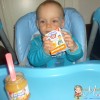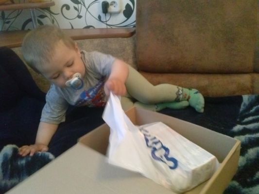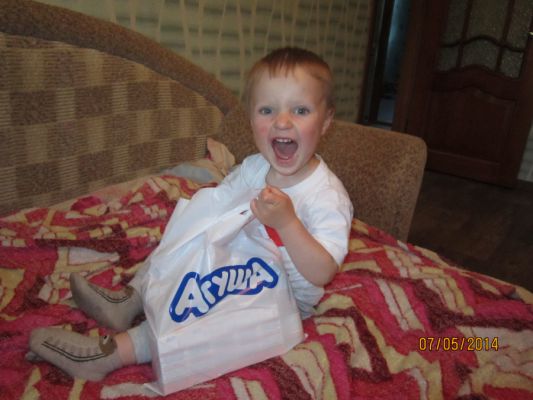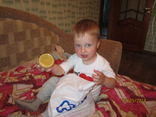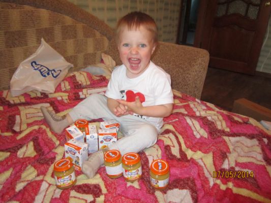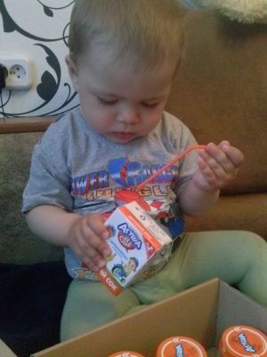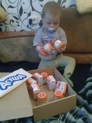 В этот раз в пакете со знакомой "лялей" нашли 5 пюрешек "Фруктовое ассорти" и 5 соков "Мультифрукт" с мякотью. Сынок уже знает, что в таком пакете его ждет обязательно какая-то вкусняшка и спешит поскорей в этом убедиться)) Малыш с удовольствием разбирал пакет и пробовал вкусняшки.