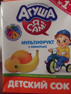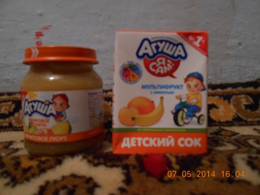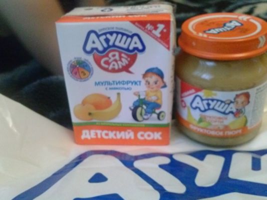 Пришла и нам посылочка от любимой агуши .5 соков мультифрукт с мякотью и 5 баночек вкуснючего пюре фруктового. Дочка уже знгает что мама с почты приносит ей вкусняшку .,и бежит на кухню за ложкой и чашкой)) Сок очень очень вкусный ,без кислинки и дочя сразу две упаковочки выпила )))хотя обычно с мякотью не очень пьет. Радует так же что сок без красителей а с натуральных компонентов ( покупали как то сок другой марки мультифруктовый , так у нас вся чашка окрасилась((( , Пюрешка тоже очень понравилась , вкусная и питательная)) И еще мы на днях попробовали пюрешке в упаковке я сам , очень очень понравилось))))