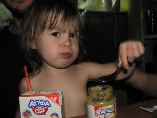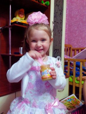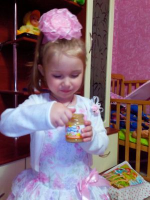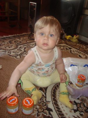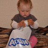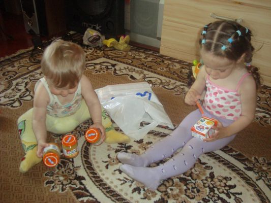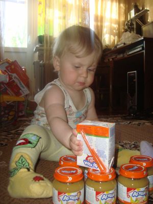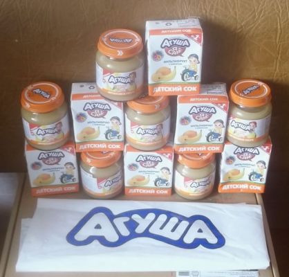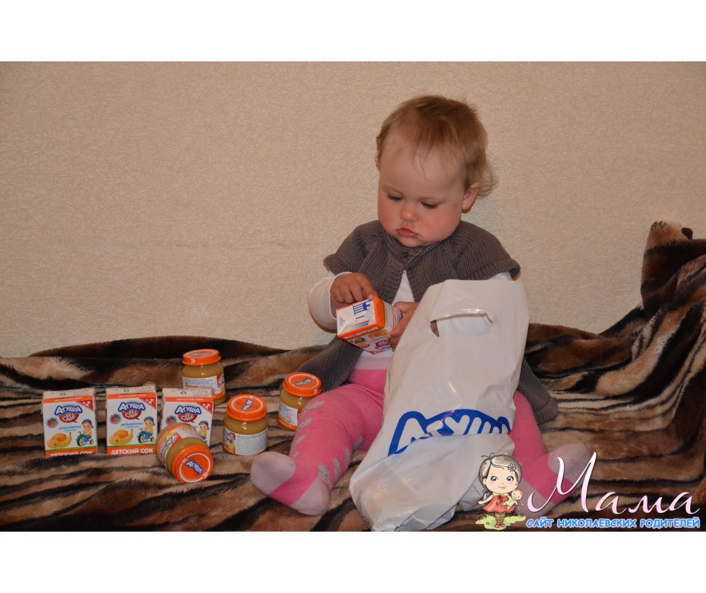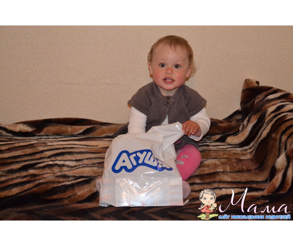 - Мы тоже получили посылочку от нашей любимой Агуши!!!Как только пришли домой Дианочка сразу начала тоскать коробку по всей квартире,пытаясь её открыть.Потом притащила её мне, с намёком"Мама открой!"Когда открыли, Диана сразу начала её изучать. Для начала поотрывала все трубочки с соков, потом исследовала все баночки и коробочки и наконец определилась, что начать дегустацию она хочет с фруктового пюре"Фруктовое ассорти". Вообщем баночку съела за пару минуток(мама еле успела одну ложечку попробовать)).
