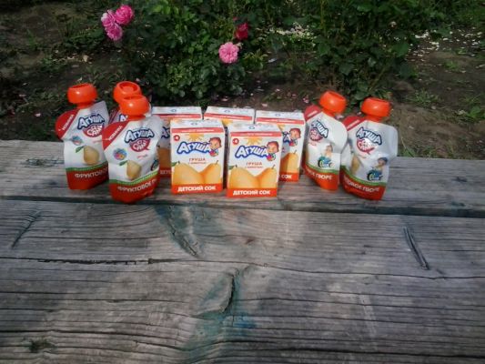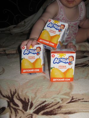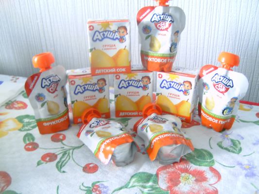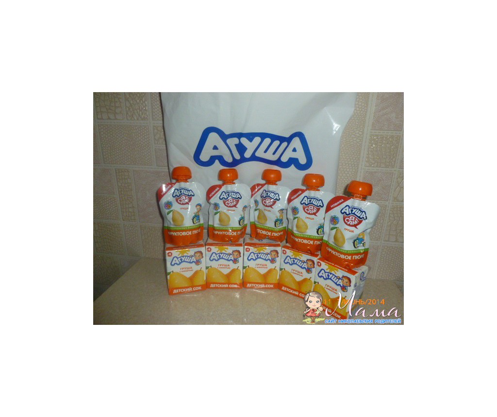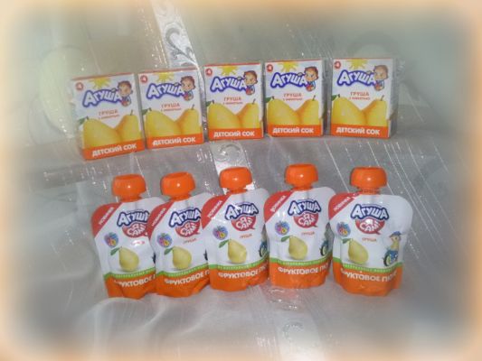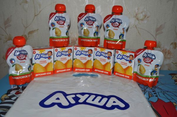 Агуша порадовала нас грушевыми фруктовыми пюре и соками. В пакете было 5 соков