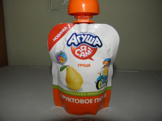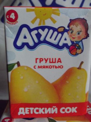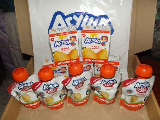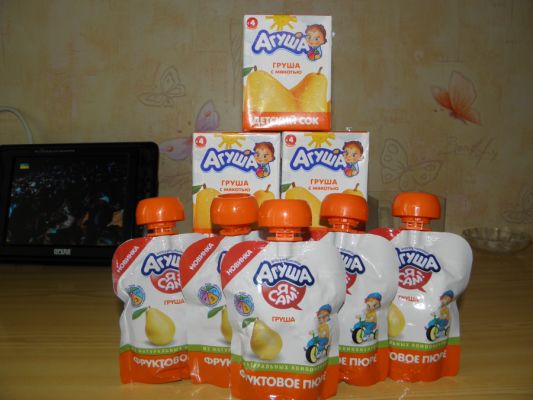 в посылочке было 5 соков грушка и пять пюрешек грушка в очень удобной упаковке