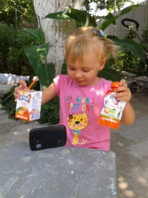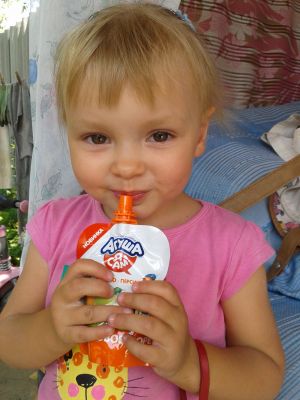 Хочу заметить, что знакомство с творожками у младшей дочки началось именно с творожка Агуша без наполнителя – это была любовь с первой ложки. Теперь мы едим с огромным удовольствием всю продукцию этой торговой марки. Берем соки и пюре с собой на пляж для перекуса. На вечер младшая дочурка кушает творожки и пьет йогурт.