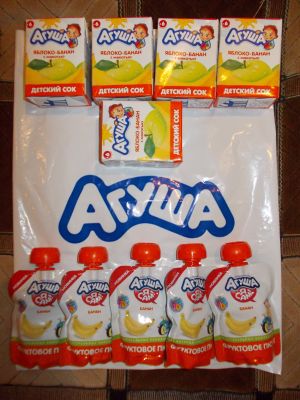 ,с вкусняшками, в посылочке было 5 соков яблоко-банан с мякотью, и 5--пюрешек банан, мы очень любим продукцию АГУША,очень любим йогурты,питьевые это очень удобный перекус для малыша,