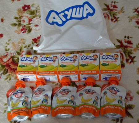 ,с вкусняшками, в посылочке было 5 соков яблоко-банан с мякотью, и 5--пюрешек банан, мы очень любим продукцию АГУША,очень любим йогурты,питьевые это очень удобный перекус для малыша,За высокое качество и множество вкусняшек Я ОДОБРЯЮ АГУШУ!!!!!!!!!!!!!