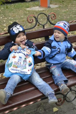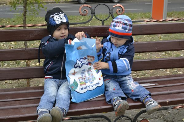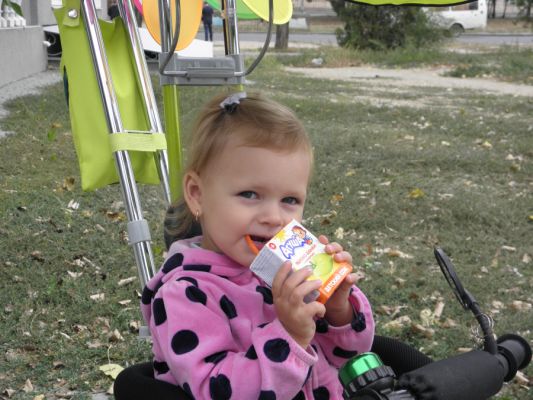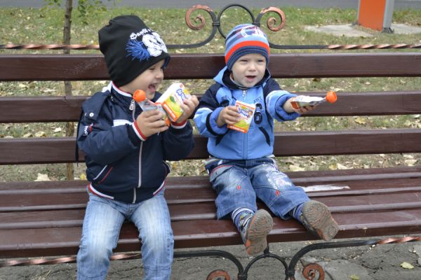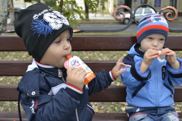 . Правда не обошлось без дележки))) Каждый хотел заглянуть в такой привлекательный пакет, что чуть не подрались за него))) хи-хи! Ну без этого никуда!Наконец добравшись до гостинцев от "Агуши", малыши с удовольствием слопали пюрешки, в такой удобной для прогулки упаковке, а потом запили все это дело вкусненьким соком! Бананчики мы очень любим, поэтому с таким вкусом пюре и сок были высоко оценены нашими маленькими "экспертами"!