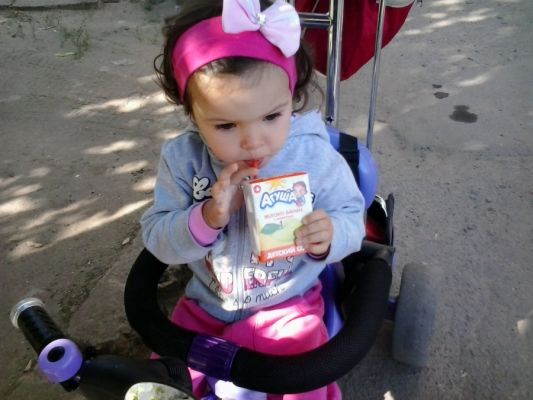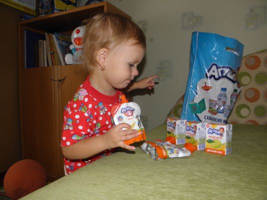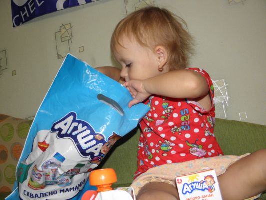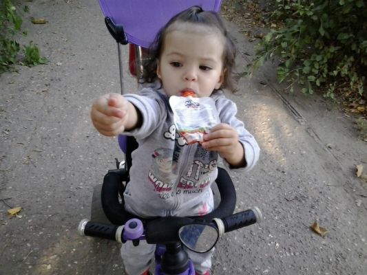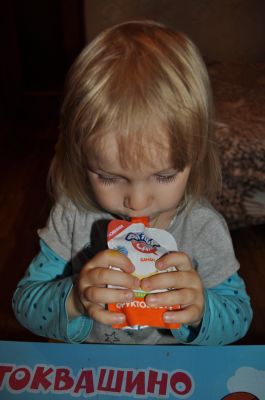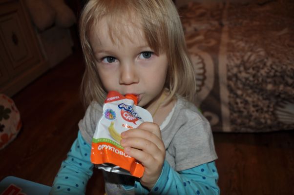 не успев доесть сразу начала просить добавку, может по пол часа пытаться выдавить с пакетика еще хоть каплю вкуснятины.
