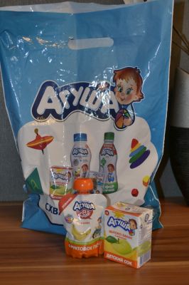 И нам посчастливилось получить уже знакомую посылочку от Агуши:)В этот раз в пакете мы с сыночком нашли соки Яблоко-банан и пюре со вкусом банана.