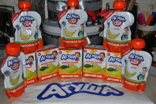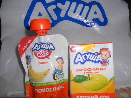 Наконец-то я добралась к компьютеру чтоб написать о любимой Агуше!!!! Вот и мы имели честь получить посылку от Агуши с 5 пьюрешками "Банан" Я сам и 5 соков "Яблоко- банан с мякотью".