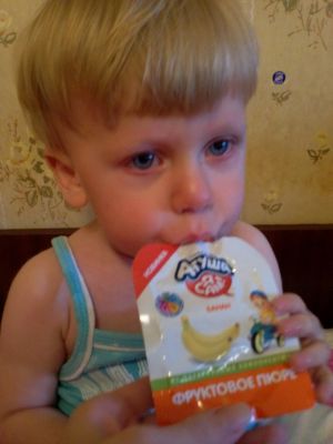Сразу же было решено продегустировать банановое пюре. Я, как мама, обязательно пробую любой новый продукт, перед тем, как предлагать его ребёнку. И этот раз не стал исключением. Вкус новинки показался мне немного необычным и интересным. Понравилось, что пюре имеет лёгкую кислинку (как оказалось, за счёт содержания в нём 2% лимонного сока) и совершенно не приторное, как можно было предположить. Яна так же по достоинству оценила новый вкус и не успев опустошить первую упаковочку пюре, схватилась за следующую. Оно ей очень понравилось!!! Это я ещё раз поняла. когда после обеда дочка снова попросила пюре (чего раньше не было)