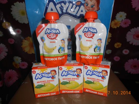 И мы получили долгожданную посылочку от "Агуши", очень были рады ассортименту-5 пюре в дой-паках "банан" и 5 соков "яблоко-банан", это самые любимый вкус нашего малыша.