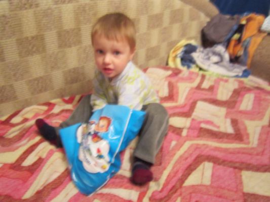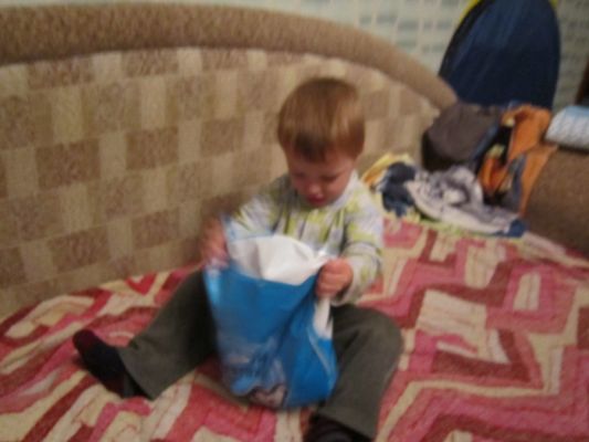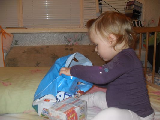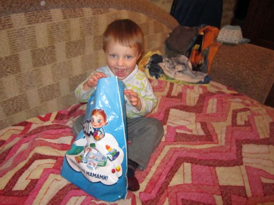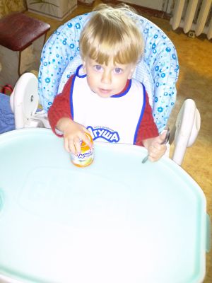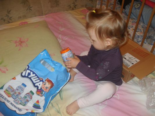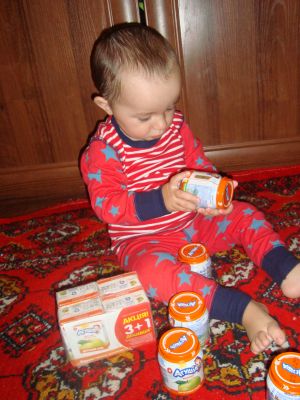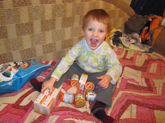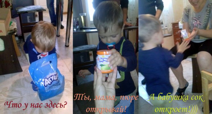 Когда пришло извещение о посылке, наш малыш спал, поэтому забирали без него. Но когда вернулись домой, оказалось, что к этому времени он уже не только проснулся, но и успел основательно подкрепиться и был абсолютно готов к приему десерта в виде фруктового пюре и сока