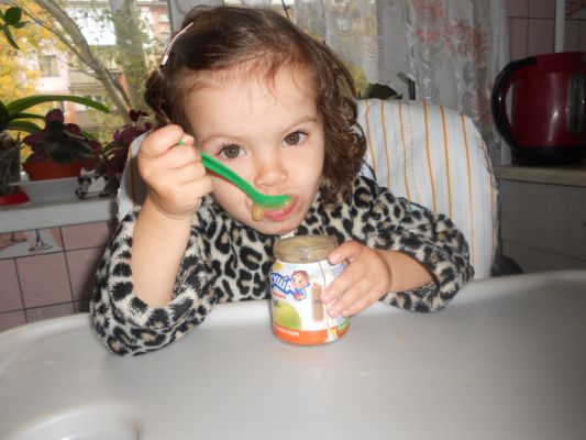 По традиции дегустацию мы начали с фруктового пюре, Оно было настолько вкусным, что всю баночку мы опусташили за пару минуток, и конечно, дали попробовать такую вкуснятину своей любимой куколке