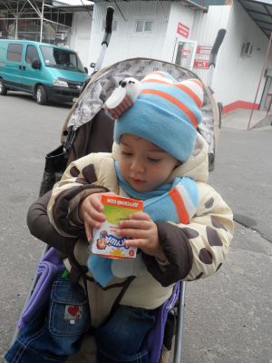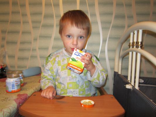 Еще в пакете малыш увидел его любимые яблочные пюрешки в баночках, которые он так любит кушать с самого детства. Но так как мама не взяла с собой ложечку, попробовать пюрешку из баночки мы не смогли и быстренько поспешили домой, потому что уже не могли дождаться, когда скушаем наше любимое и замечательное пюрешко. А по дороге домой малыш с большой радостью пил сок и пока не выпил все до последней капли не успокоился.