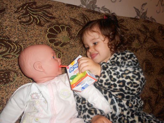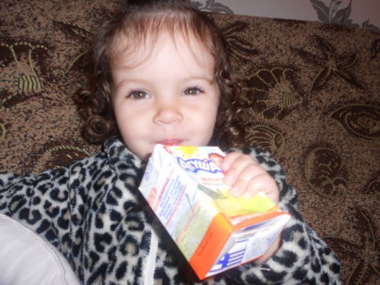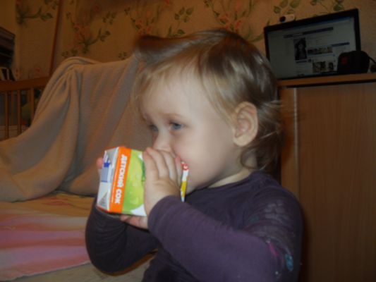 После мы практически залпом выпили всю упаковку яблочного сока, это, наверно, единственный сок от которого мою малышку просто за уши не оттащишь.