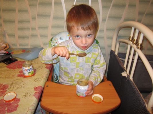 А потом уже началась дегустация. Хотя и сок, и пюре с яблочком мы уже кушали не раз, с огромным удовольствием слопали по баночке. Приятный вкус яблочка, с легкой кислинкой пришелся нам по душе)