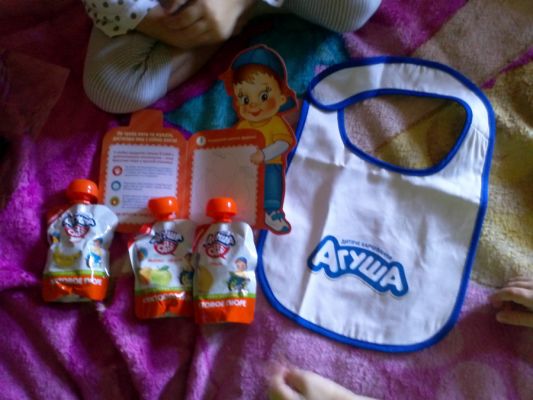 А еще недавно мы получили подарочек от "Агуши"! 3 пюрешки в упаковке "Я сам" банан, яблоко-персик, груша, фирменный слюнявчик и маленький буклет с раскраской.