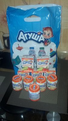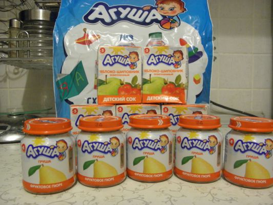 И мы вчера получили наш подарочек от "Агуши": 5 пюре "груша" и пять соков "яблоко -шиповник".