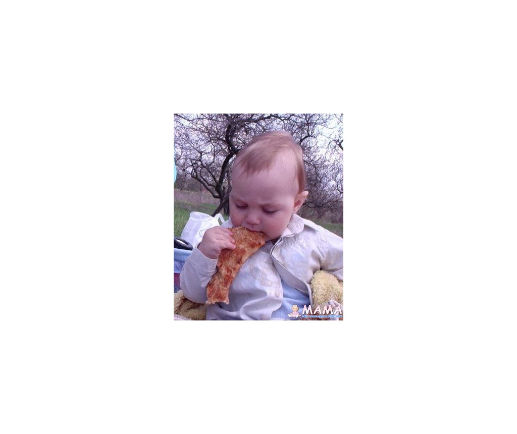 Вот нашла фотку. Пикник на Пасху. Детенышу 10,5 мес. Это приготовленный на решетке стейк из индюшиного филе. Сам процесс выглядел довольно забавно - откусывает кусочек, тщательно пережевывает и готовое "пюре" выплевывает