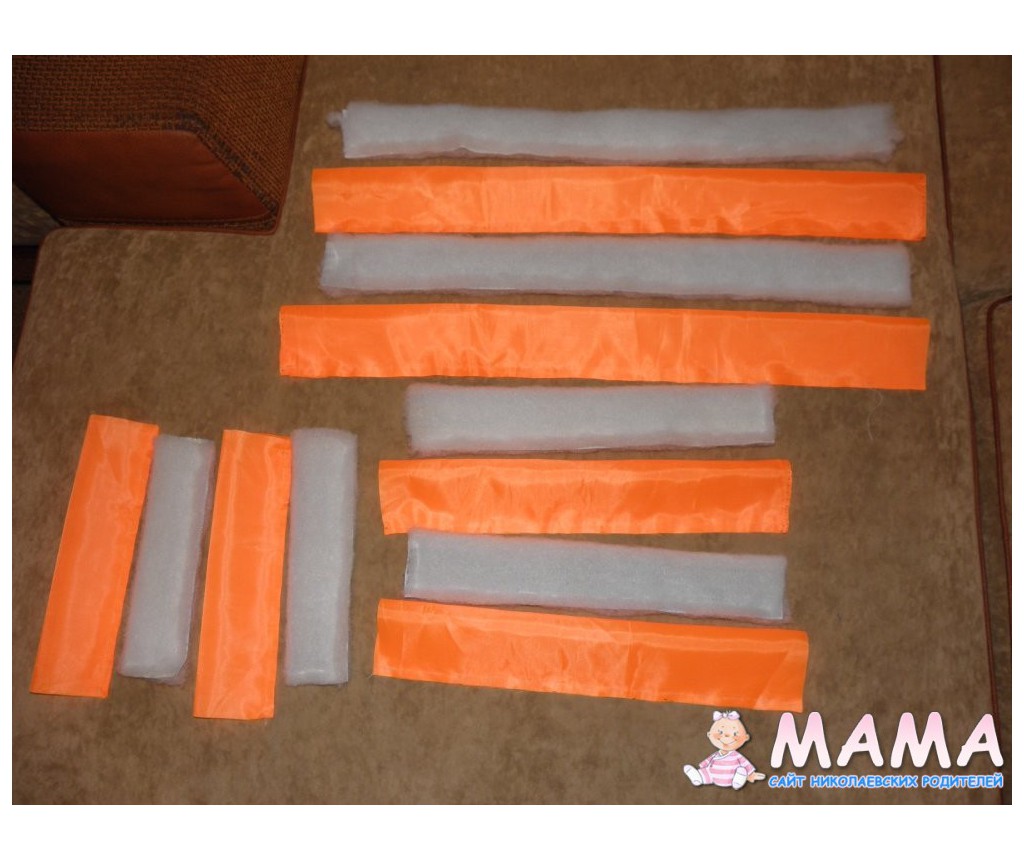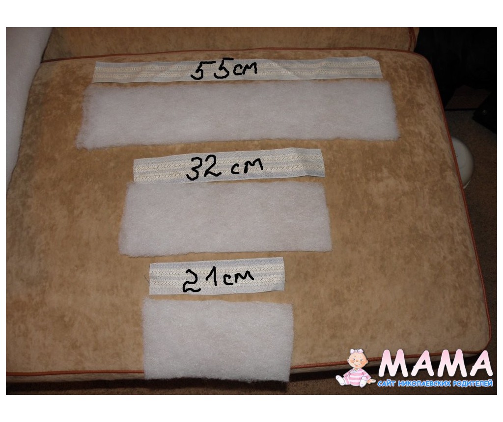 Была секунда раскроила смягчающие подкладки.Выкраиваем всех по 2 детали каждого размера, здесь раскроен один комплект: 21 см-это плечики, 32 см - это на ножки, и 55 см- 2 лямочки на пояс.Оборачиваем корсаж синтепоном и смётываем.Ширина синтепона везде 11 см.