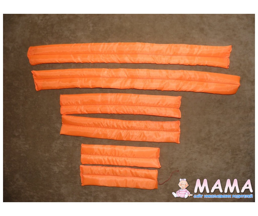 Ну где-то от года и до 4.У младшего просто немного провисало сверху сначала,а на старшего сейчас совсем в притык в поясе,весит он 21 кг.Но в этих сделаем с двух сторон регулировку по объему.В старых с одной стороны регулировка и ее уже не хватает.Ножки идут на липучках и с возрастом перелепляются в зависимости от объема ножки.На моих есть крепления для сальто,но мои ни когда этим не увлекались.Так что лишнее сверху ни каким образом мешать не будет.Сейчас шьем заготовки,а размер по возрасту будет регулироваться при сшивании поперечных и продольных полосок.