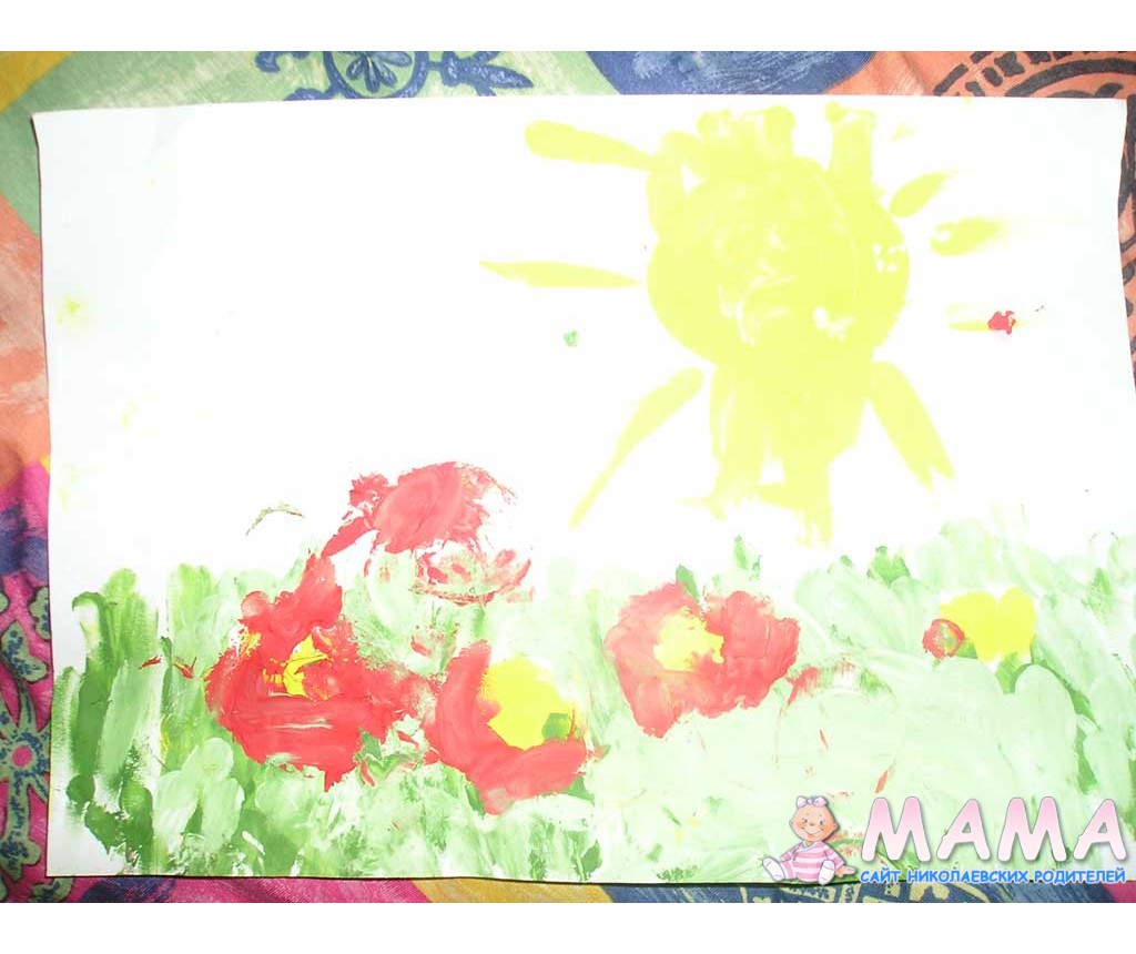 06 September 2009 Нам в то время нравилась зеленая и красная краска, рисовали линии и кляксы ставили,- получилась трава и цветы, а солнышко уже в конце пририсовали.