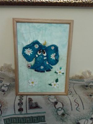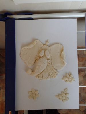 Это открытка из соленого теста разрисованная красками и покрытая бесцветным лаком для ногтей .