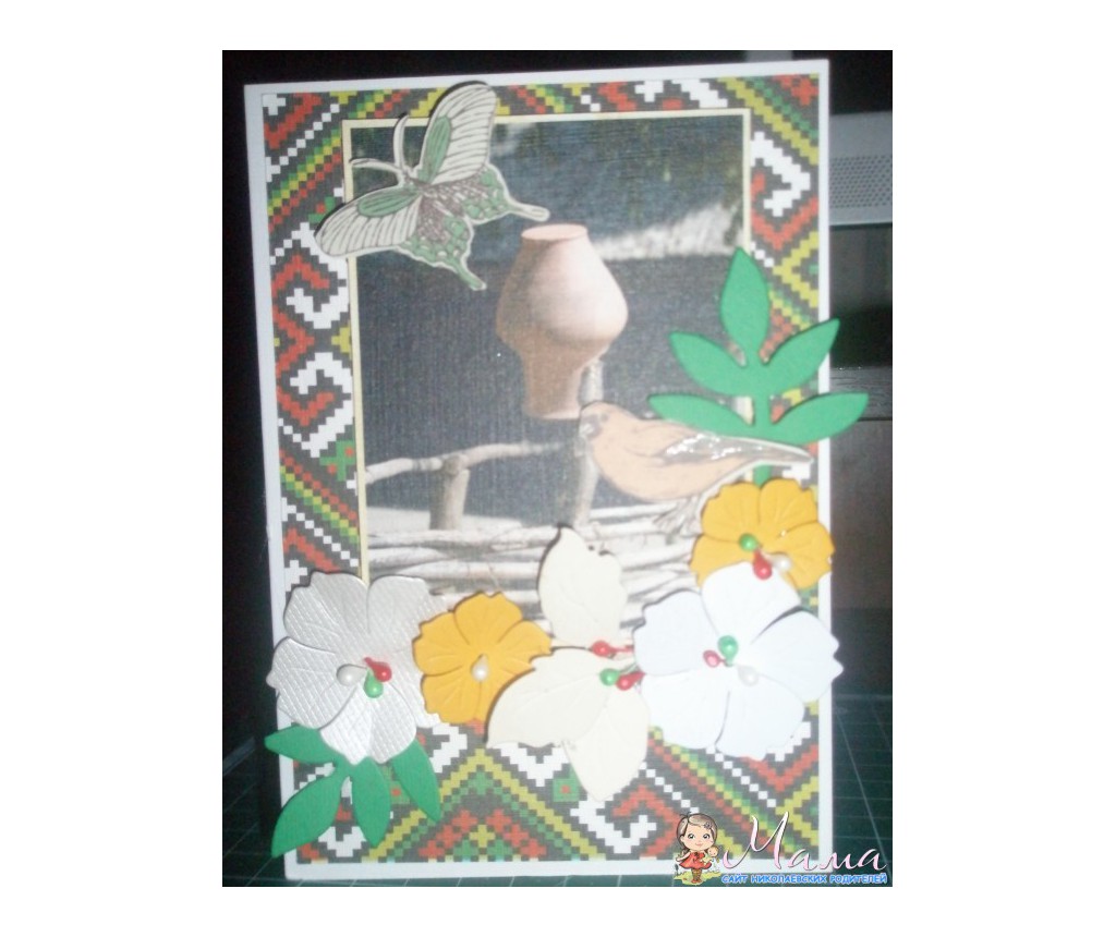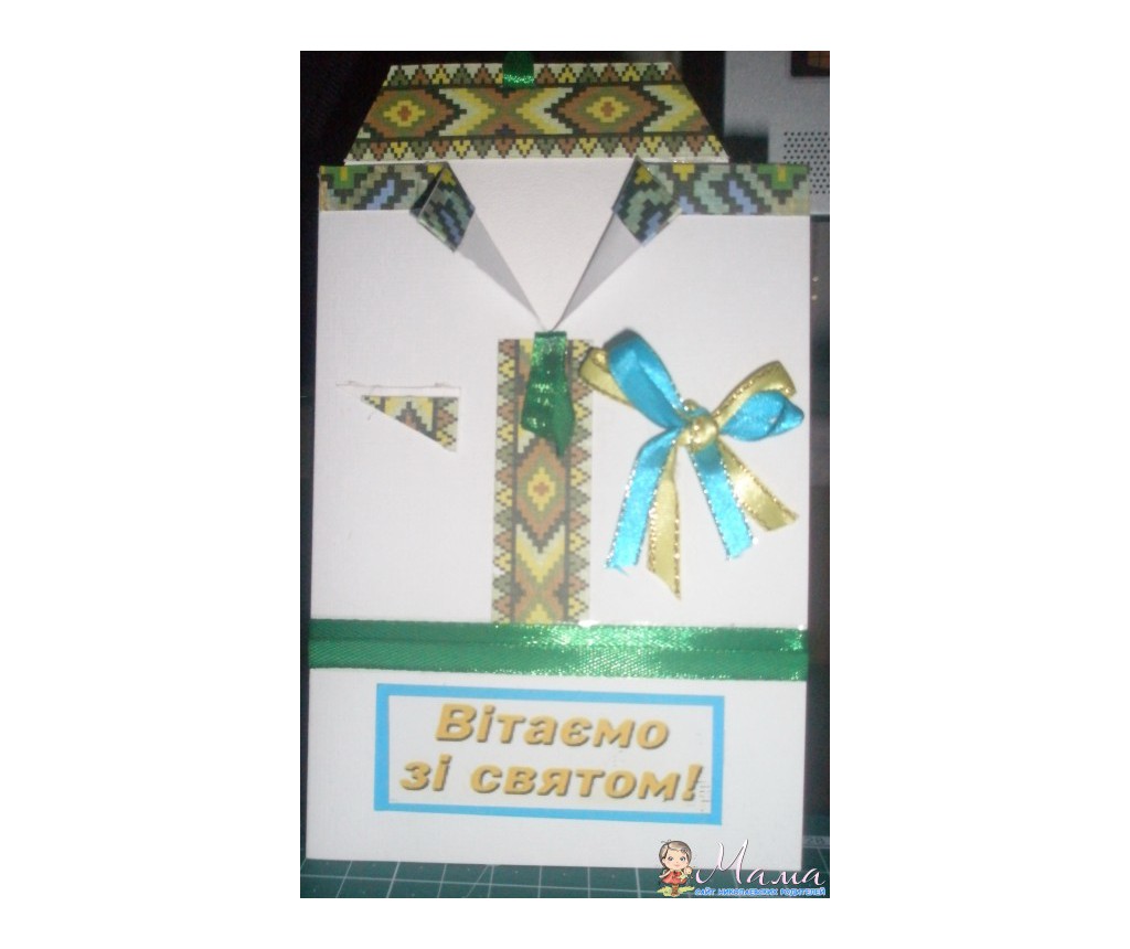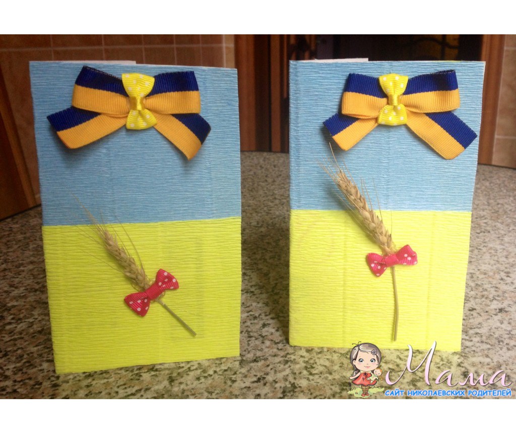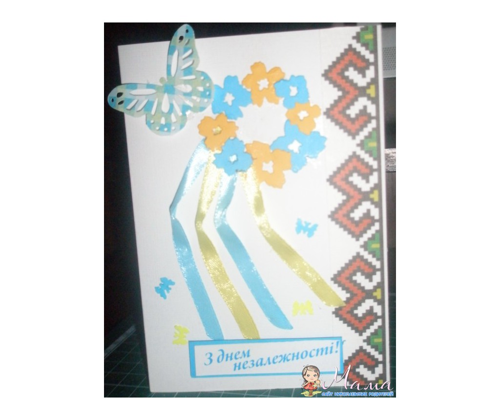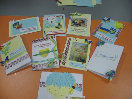 а мы вот с детьми делали из цветной бумаги для принтера, распечатали укр. орнамент, укр. символику и бабочек вот такие открытки получились.