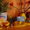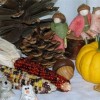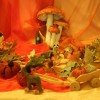 Это было в нашем советском детсадовском детстве - полочки с поделками из природного материала по сезону. А вычитывая инфу по развитию ребенка я столкнулась с очень прикольной вариацией на эту тему у вальдов. Речь о столике времен года, в одной из тем о нем уже упоминали. Я решила попробовать. Идея в том,что некое место тематически (по временам года) оформляется характерными штучками. "Экспонаты" (в небольшом количестве) постепенно меняют друг друга, а ребенок изучает окружающий мир. Ну вот мы и начали с осени. Деревянный домик будет у нас постоянным статичным элементом картинки. Привезли тыкву, налили немного меда в советскую "бочку", бросили горстку желудей,принесенных с прогулки. Вчера от бабушки привезли бархатцы (чернобрывцы),мед съели с чаем,поставили блюдце со сливами из бабушкиного сада, скоро принесем каштаны и орехи, "цветные" листочки, поделки из природных материалов и т.д. Все,что рассказывает о красоте осени.