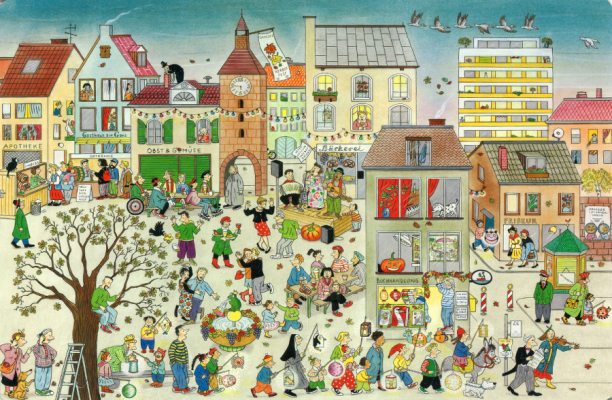 книжки-картинки, или как их еще называют wimmelbuch, совершенно прекрасные у Бернер. у нее есть целая серия Городок, там один и тот же город в разные времена года. очень любим эти книги. у них большой формат, примерно А3, и плотные картонные страницы. если заинтересуют, то они есть в наличии в нашем магазинчике, можно посмотреть, потрогать)